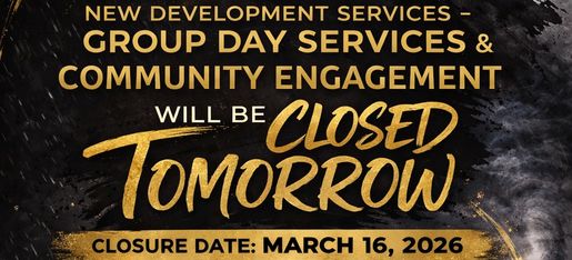 New Development Services – Group Day Services & Community Engagement Services will be CLOSED tomorrow due to severe weather conditions and a tornado watch in our area.